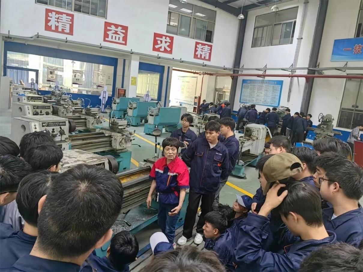 在实训期间,渭南技师公司的带训老师认真向同学们讲解普通车床和普通铣床的操作,指导员工安全规范操作。